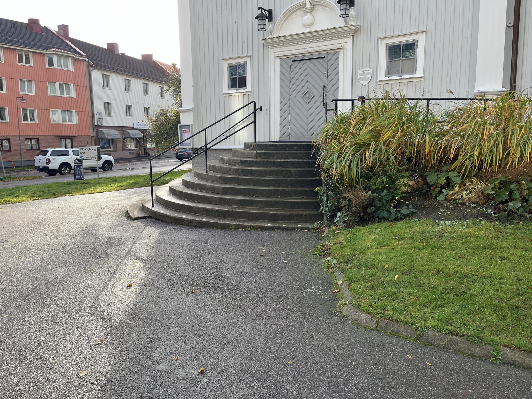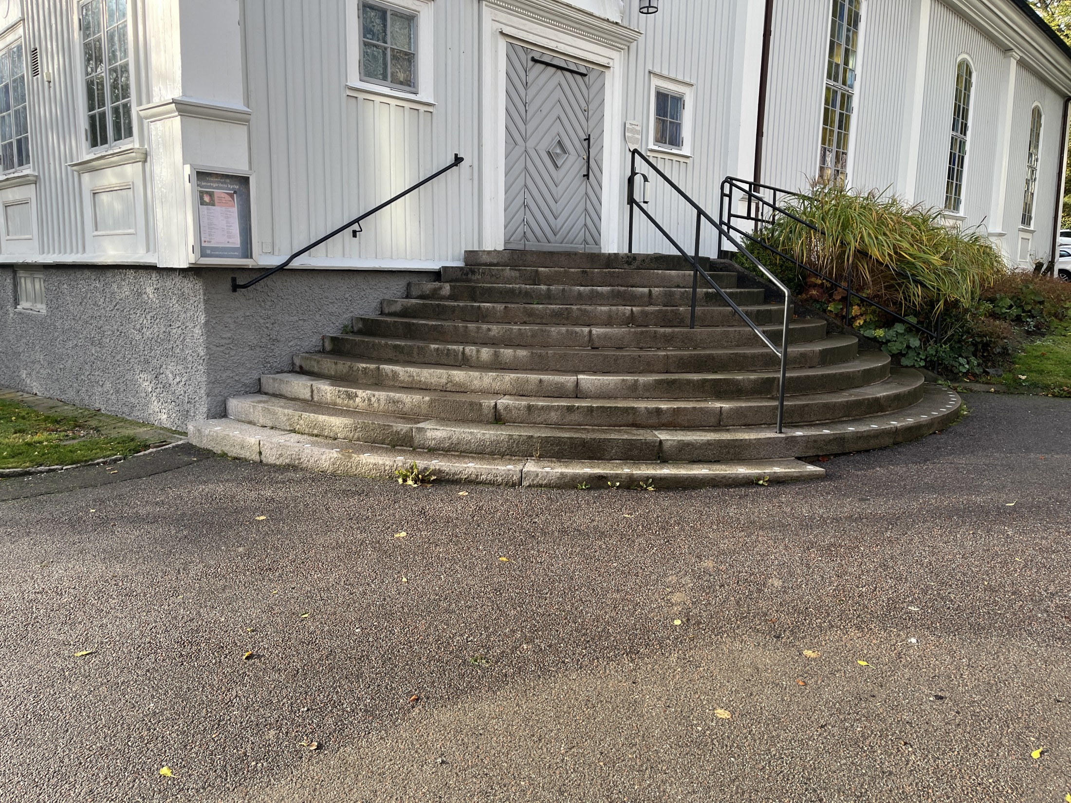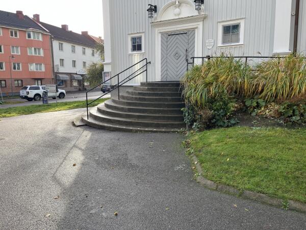 Befintlig trappa till kyrkan har stort kulturhistoriskt värde. Trappan skall demonteras, anpassas samt återmonteras.